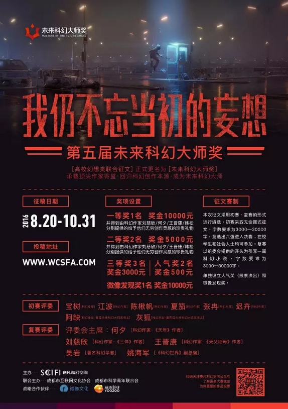 经过4年的发展,“未来科幻大师奖”累积投稿量近千篇,同时涌现出阿缺、灰狐、胡绍晏、念语等一批活跃在科幻文学创作一线的科幻作家,其中历届征文比赛中的部分获奖作品也正在影视转化的制作过程中。2016赛凡科幻空间携手成都市互联网文化协会、成都市科学青年联合会正式启动第五届“未来科幻大师奖”,我们热诚期待您的参与。