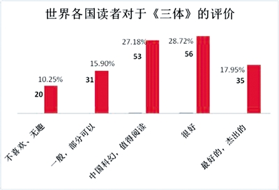 在作品风格和故事情节的分析中,有27.18%的人明确提到了“中国科幻小说”,有28.72%的读者认为“很好”,17.95%的读者认为《三体》是“最好的”“杰出的”小说,三项合计为73.85%,恰好印证了2万多读者给《三体》打出4分、5分的人数比例。可见“中国科幻”小说、“非西方风格”是《三体》赢得世界上这么多读者青睐的主要原因。比如有个英国读者写到:“作为一个英语国家的读者,我读的大部分小说都是西方式的或者英语国家式的。这部小说让我读起来感觉很新鲜,人物不再是常见的美国式的、英国式的或者欧洲式的,也不是澳大利亚式的。读刘慈欣的书,既是阅读一部包含中国历史文化的科幻小说,也是阅读一部不以英语国家和说英语的人物为中心的小说。”有美国读者写道:“没有让我失望,与我读过的科幻小说很不一样,期待阅读下一部。”“我很喜欢这部小说,它充满了令人惊喜的科学概念,此外小说中的观点是非西方式的。”
