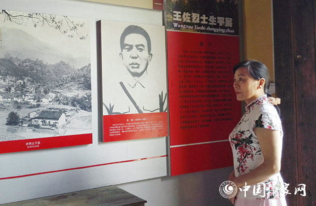 旷胡兰在井冈山下庄村王佐故居观看王佐烈士生平展
