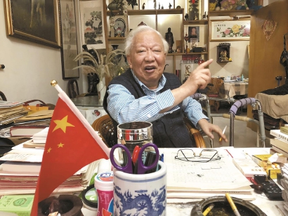 83岁的胡福明在自家客厅坐着,方桌就摆在玄关位置。任何来客一进门就能看见老爷子的桌面,从右到左摆着《马克思恩格斯选集》《毛泽东选集》(第三卷)《习近平谈治国理政》、最新一期的《新华文摘》《求是》杂志。第二排,依次是当天的《人民日报》,插着国旗和笔的笔筒、水杯、一罐风油精。最靠近胡福明身体的位置,摆着一沓绿格文稿纸。压在文稿纸上的,是一副眼镜、三只打火机、两包香烟,和胡福明被香烟熏黄的左手。