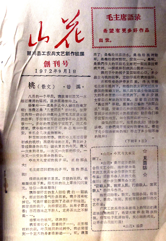 《山花》是由陕北著名诗人曹谷溪、已故著名作家路遥等人于1972年创办的一张地方文艺小报。