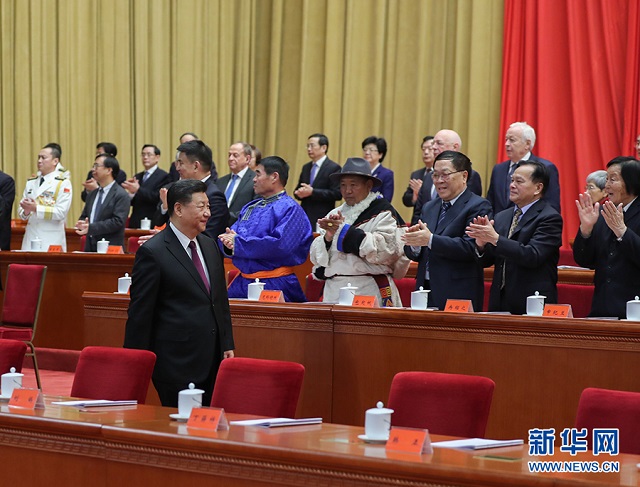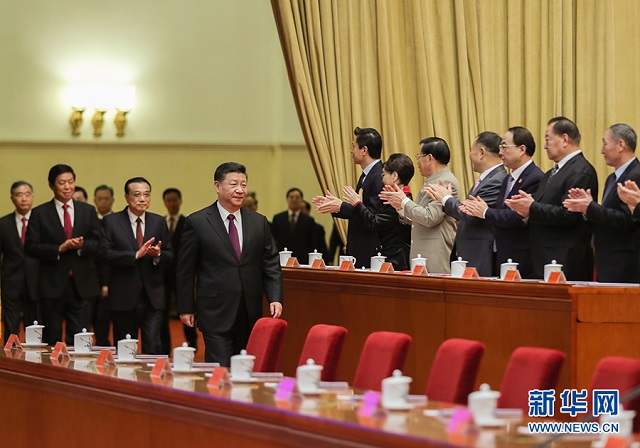 当习近平等领导同志进入会场,全场起立,热烈鼓掌。