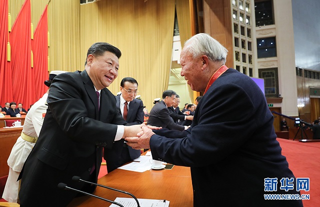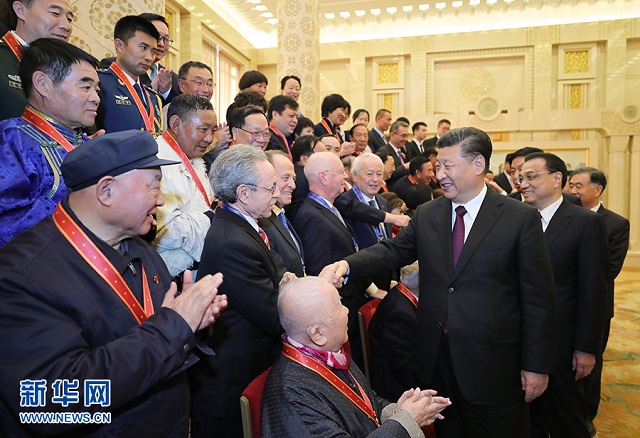 12月18日,庆祝改革开放40周年大会在北京人民大会堂隆重举行。中共中央总书记、国家主席、中央军委主席习近平在大会上发表重要讲话。这是习近平等为获得中国改革友谊奖章人员代表颁奖。 新华社记者 鞠鹏 摄