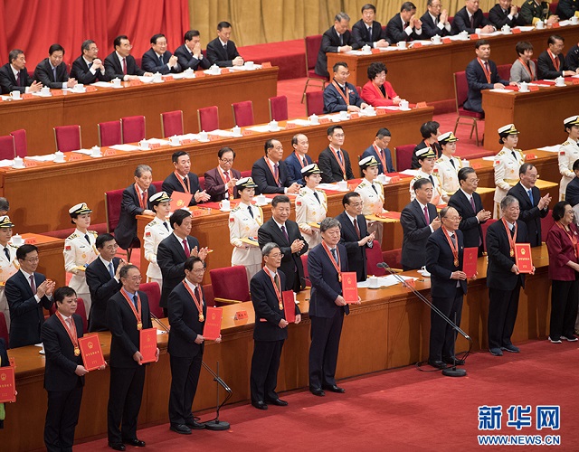 在《春天的故事》乐曲声中,习近平等为获得改革先锋称号、中国改革友谊奖章人员代表颁奖。