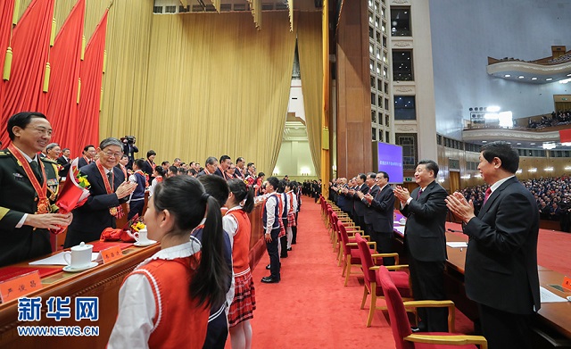 12月18日,庆祝改革开放40周年大会在北京人民大会堂隆重举行。中共中央总书记、国家主席、中央军委主席习近平在大会上发表重要讲话。这是习近平等鼓掌向受表彰人员表示祝贺。 新华社记者 鞠鹏 摄