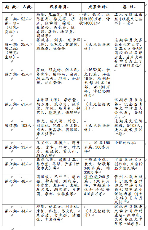 26 1980 年1 月8 日,中共中央宣传部批复同意恢复中国作家协会文学讲习所后,又举办了小说创作班、少数民族文学创作班、编辑及评论班三期,第八期学员因为1984 年9 月文学讲习所更名为鲁迅文学院而自然进入鲁迅文学院学习。因此,有人说中央文学研究所一共只开办了七期半。