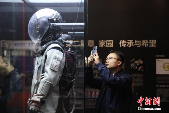 资料图:展出的电影《流浪地球》中的服装道具“地表防护服”吸引观众。中新社记者 蒋启明 摄