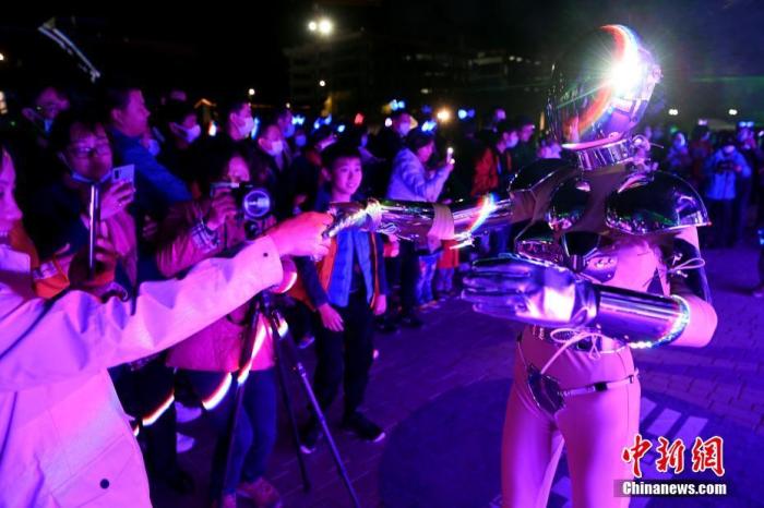 资料图:11月1日,2020中国科幻大会“科幻之夜”活动在北京首钢园三高炉举行,酷炫的灯光秀等内容为市民的周末生活增添乐趣。图为机器人模仿秀的表演者与市民互动。中新社记者 侯宇 摄