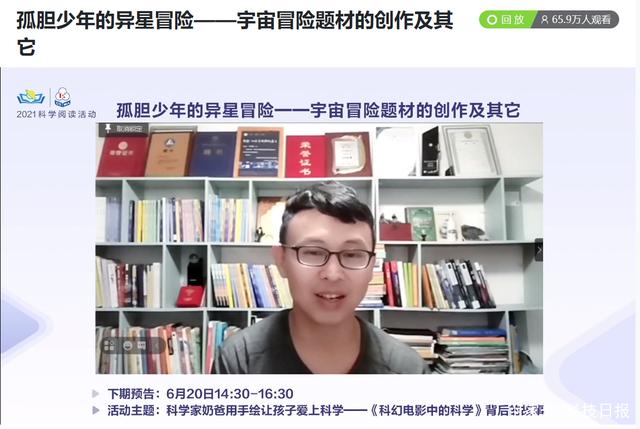 5月29日,中国科普作家协会2021科学阅读活动(第一季)第七期邀请科幻作家马传思和北京景山学校正高级语文教师周群,进行“孤胆少年的异星冒险——宇宙冒险题材的创作及其它”主题分享。本次活动由中国科普作家协会、中国科幻研究中心主办,《科学故事会》杂志协办,清华大学学生科幻协会、北京大学学生科幻协会、首都师范大学科幻协会、中南财经政法大学科幻爱好者协会、安徽科技出版社、安徽少年儿童出版社、大连出版社、清大紫育提供支持,在新华网、科学加、知乎、小鹅通、哔哩哔哩等多个平台同步直播,线上观看人次接近80万。
