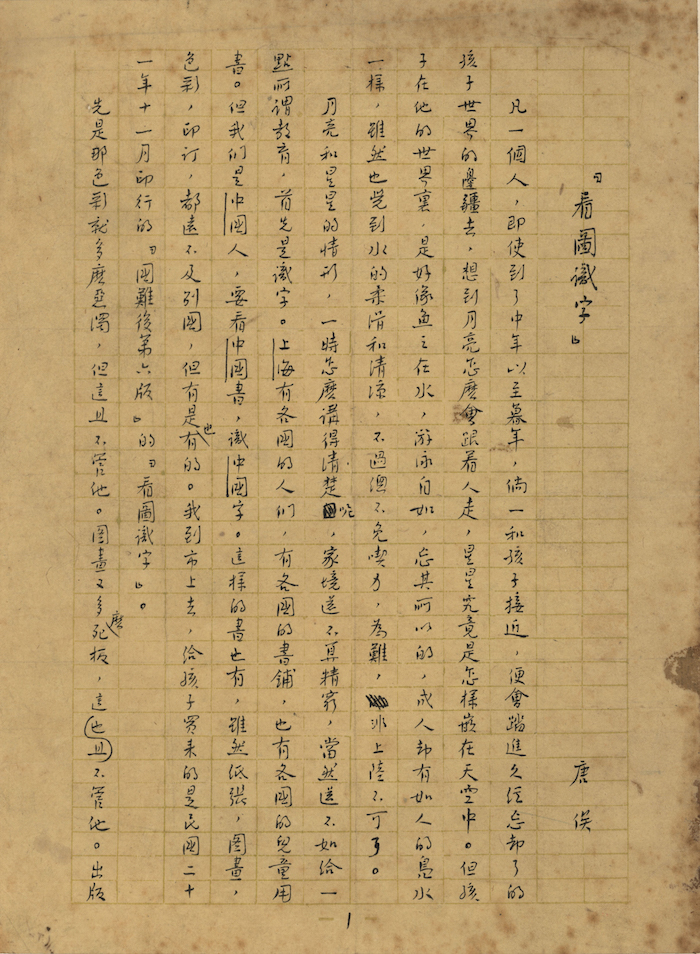 展品《看图识字》手稿则是鲁迅作于1934年5月。文章主旨是谈儿童识字教材问题,指出当时畅销的儿童识字本是“二十七年前”编定的,书中内容以及图像与1930年代脱节。