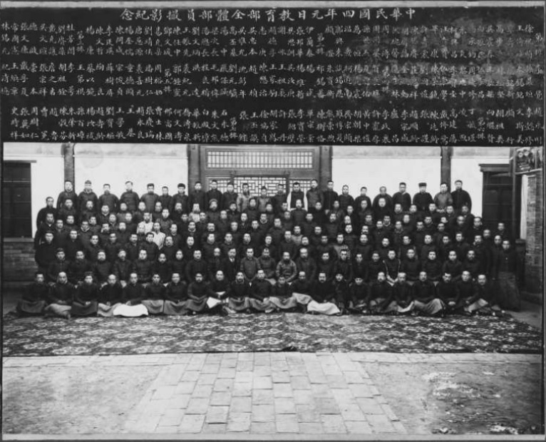 1915年1月5日摄于北京。系中华民国教育部全体人员合影。鲁迅在教育部任社会教育司第一科科长,主管图书馆、博物馆、美术馆等事项。后排左起第三人为鲁迅。