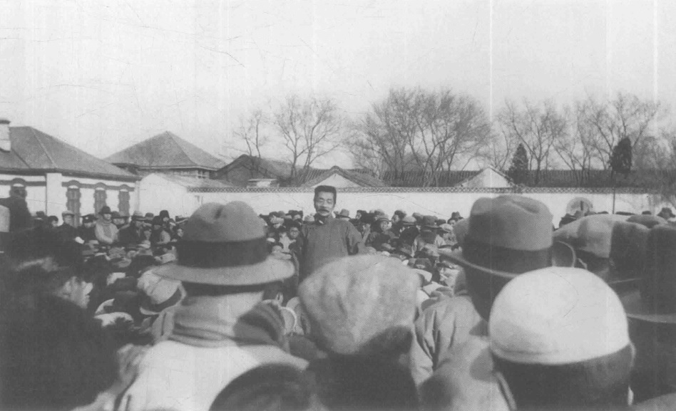1932年11月27日摄于北京。1932年11月,鲁迅赴北平探望母亲期间,分别应北京大学、辅仁大学、女子文理学院、北京师范大学、中国大学之邀,发表了著名的“北平五讲”。图为鲁迅在北京师范大学演讲。在北师大的演讲,起初在教室内,但听众甚多,只好转到室外,大家把鲁迅抬到方桌上。这一天演讲的题目是《再论“第三种人”》。