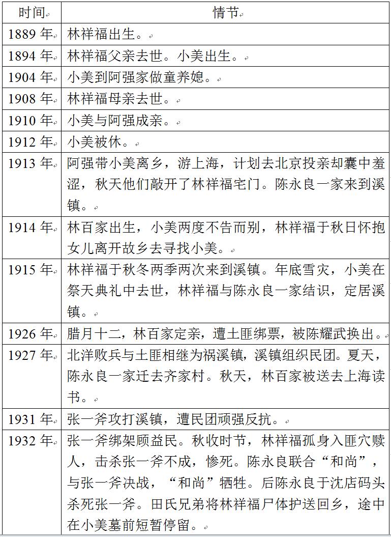 的确,《文城》里无一处提及具体年份,但若据此断定小说背景不具备历史与时代的精确性,就有失武断。正因旅长到来,大历史降临溪镇,让我们有机会将这部个人精神成长的故事放置在具体历史坐标当中。北洋军进入溪镇,是因为与国民革命军交战落败,可知时在北伐战争期间。溪镇位于长江以南600里之地,而国民革命军与北洋军交战于这一区域,应在1926年底至1927年夏。当年腊月二十七,顾益民派去给土匪缴纳赎金的使者因遭遇两军交火无功而返,其后至少过去四天,31旅长才抵达溪镇,季节在寒冬,应未出丁卯年正月,公历为1927年2月。此时林百家12岁整,而她又出生在夏天,可知林百家生于1914年。这一年林祥福25岁,则他与李大钊、刘文典同龄,生在1889年。由此,《文城》的时间表(见表1)可谓一清二楚。
