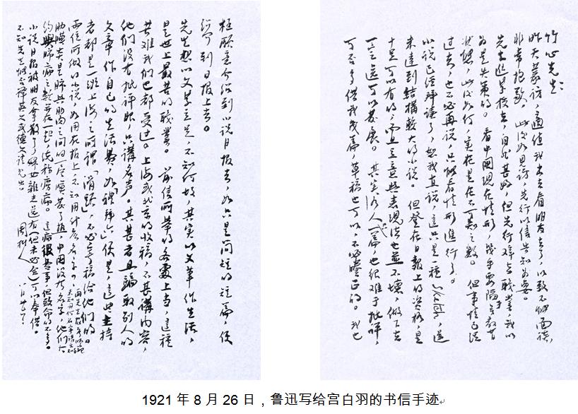 宫白羽回复鲁迅“英文可以勉强译述”,还“批评了新小说”,告诉鲁迅“我最爱的作家是鲁迅和冰心,冰心的小说很雅逸”。这时鲁迅才意识到这位请求自己推荐投稿,还大谈心得的年轻人并不知道周树人就是自己,于是在9月9日的回信中坦承自己就是鲁迅。并说“冰心的文章虽雅逸,恐流于惨绿愁红;认为叶绍钧和落花生(许地山的笔名)的作品不错”。宫白羽后来在他的自传《话柄》中有这样的描述: