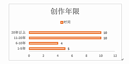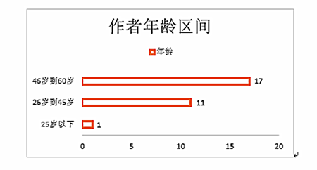 我们将年龄划分为三个区间,可以看到作者的年龄跨度较大,年龄最小的尚在读高中,一边学习,一边写作,从事文学创作仅一年。年龄最大的创作至今已有20年。但这也还不是这群作者中创作年限最长的,有人已经有近40年创作历史,所有作者中有大约三分之二创作年限都在10年以上,可以称得上是比较有经验的写作者了。