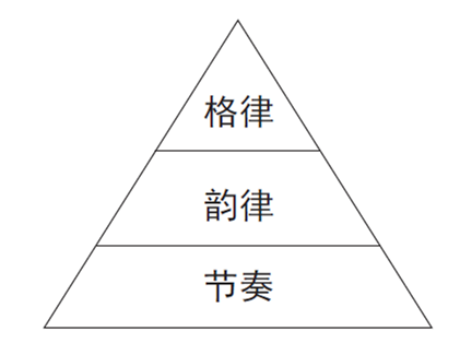 在区分了“格律”与“节奏”外延上的广狭区别之后,就有必要再讨论一下它们在内涵上有何区别与联系,并思考“格律”与“节奏”之间的互动在历史中是如何展开的,即“格律”是如何在“节奏”的基础上一步步产生的;而到了现代,为何又被很多语种的诗歌(包括汉语)普遍地废弃的。关于这个问题,帕斯有精到的观察:“格律源自节奏,也会返回到节奏。最初,两者的界限是模糊不清的。尔后,格律凝结成固定的模式。这既是它光辉的时代,也是它僵化的末世。当韵文脱离了语言的涨潮与落潮,就蜕变成了声响度量。和谐之后,便是僵化……”42可以进一步说,如果说韵律是种种诗歌声音的规律性和原则的总称话,那么格律则是这些原则中的一部分在诗歌史中凝结成的固定的、约定性的体系,因此也是历史性的,相对的;而非格律的韵律则是写作中自发形成的不固定的原则与方法。正是在这一意义上,T. S. 艾略特断言:“一个韵律学(prosody)体系不过是一系列相互影响的诗人的节奏所具有的共同点的程式化(formulation)而已。”他指出:“自由诗是对僵死的形式的反叛,也是对新形式的到来和旧形式的更新所作的准备。”43从这些认识出发,我们可以将“节奏”“韵律”“格律”三者的关系以一个金字塔图示: