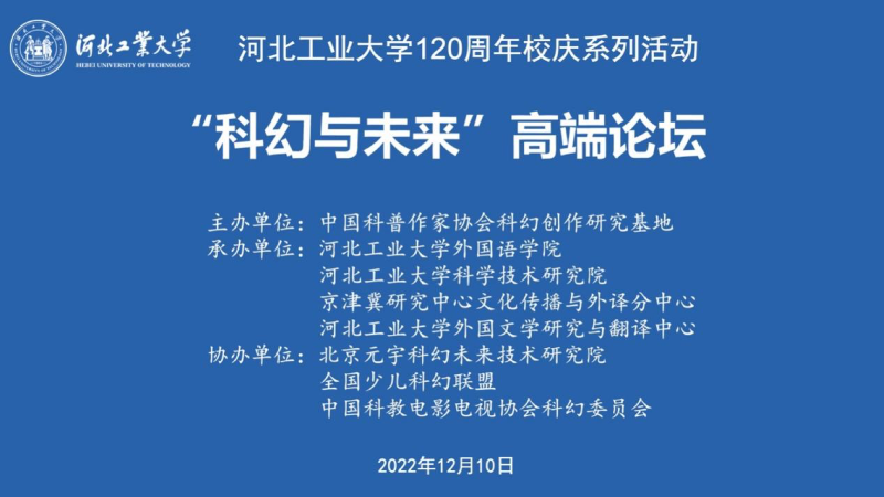 为繁荣科幻创作、发展科幻事业、激发全民族创新创造活力、提升全民科学素质,同时促进科学技术普及和科幻事业与产业发展,为支撑服务经济社会发展服务,12月10日下午,河北工业大学120周年校庆系列活动“科幻与未来”高端论坛以线上会议的形式成功举办。论坛邀请科幻创作与科幻产业研究领域的十余位作家、学者就“科幻与未来”这一主题展开探讨,共同畅谈科幻发展。
