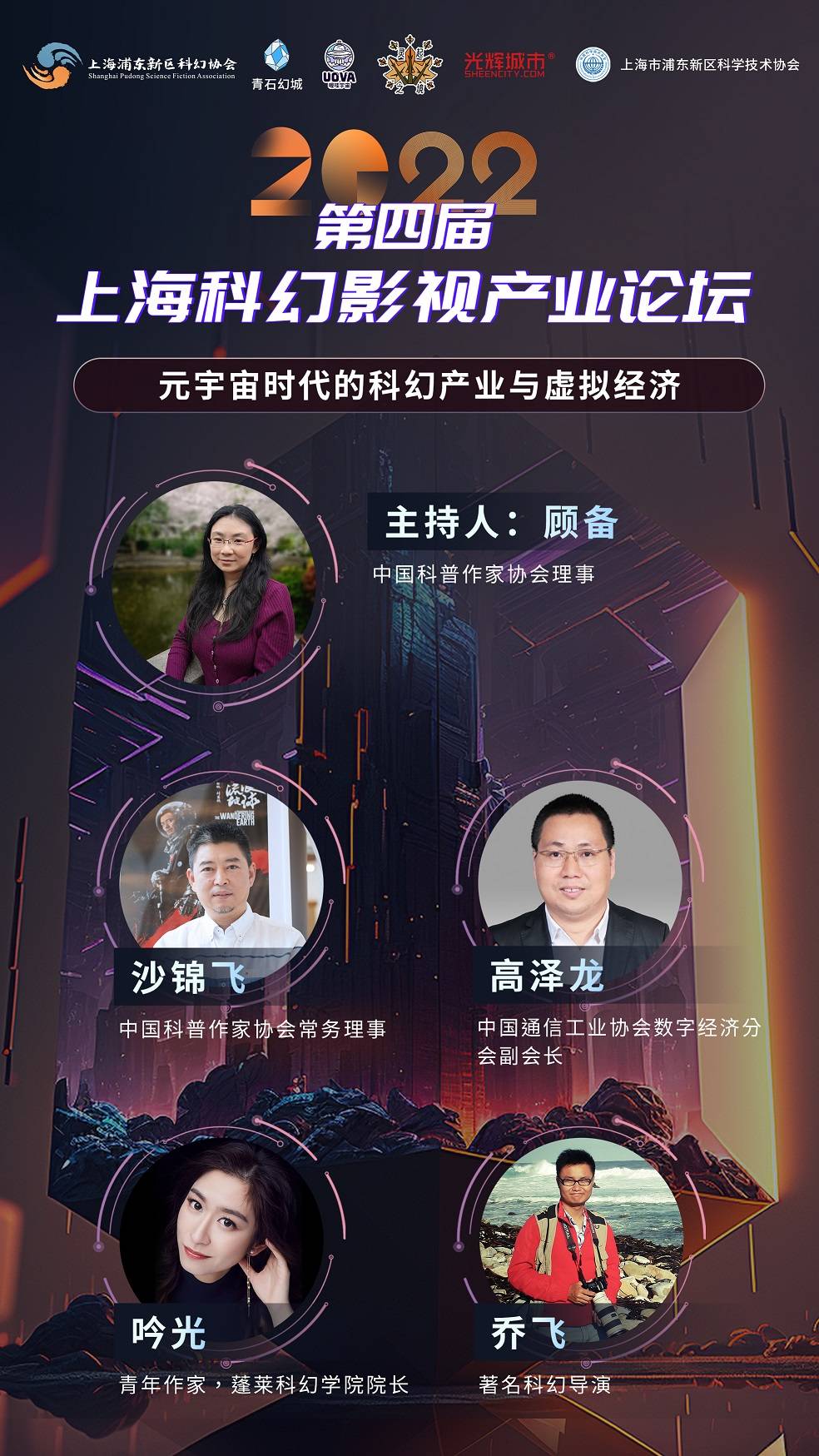 12月30日-31日, 2022第四届上海科幻影视产业论坛以线上直播的形式举行。本次论坛由中国科普作家协会、中国民营文化产业商会、上海浦东新区科学技术协会主办,中国电影家协会任指导单位,中国科教电影电视协会专业工作委员会、科幻委员会,中国科普作家协会科幻电影专业委员会,上海科普作家协会和上海国际旅游度假区管委会,全国少儿科幻联盟等任支持单位,上海浦东新区科幻协会、上海灵起之境文化传媒有限公司、光辉城市(重庆)科技有限公司等共同承办。在聚焦科幻影视产业发展的基础上,本届论坛将重点关注元宇宙时代下科幻数字文娱产业与元宇宙技术的结合与未来展望,以多个专场论坛、高层对话及项目路演的形式,带来一系列2022年最新科幻元宇宙技术与科幻文娱产业结合的技术分享与成果展示,全面推动科幻元宇宙产业联动与合作。