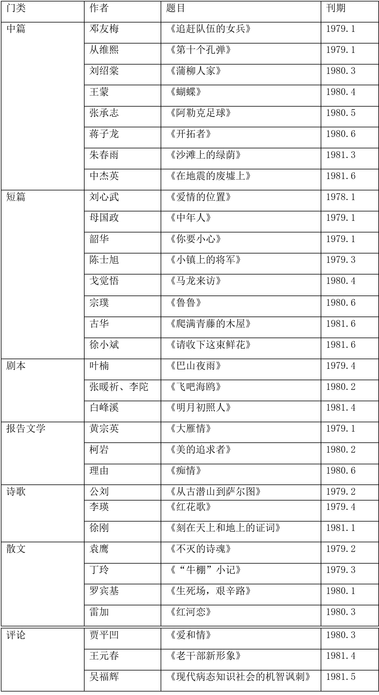 从首届《十月》文学奖评奖情况看,由于“伤痕”“反思”文学在新时期初期构成了文学的主要潮流,因此这一类作品在首届《十月》奖的评奖中占据了绝大多数,体现了《十月》对社会生活的关注和对文学潮流的呼应及引领。同时,这些获奖作品在艺术上也呈现出多元倾向,体现了《十月》文学奖在坚持现实主义立场的前提下,又重视并强调一种兼容并包的大刊气度,对现实主义之外的诸多创作也给予了一定程度的认可与吸收。如获奖中篇小说刘绍棠《蒲柳人家》(1980.3)、王蒙《蝴蝶》(1980.4)、蒋子龙《开拓者》(1980.6)、朱春雨《沙滩上的绿茵》(1981.3),获奖短篇小说陈世旭《小镇上的将军》(1979.3)、古华《爬满青藤的木屋》(1981.2)等,这些作品从选材、手法、形式和风格都不尽相同,其中有很多开新时期风气之先,并因影响巨大获得了国家级文学奖项。③透过这些获奖作品我们不难看出首届《十月》文学奖的包容性与含金量。(参见表1)