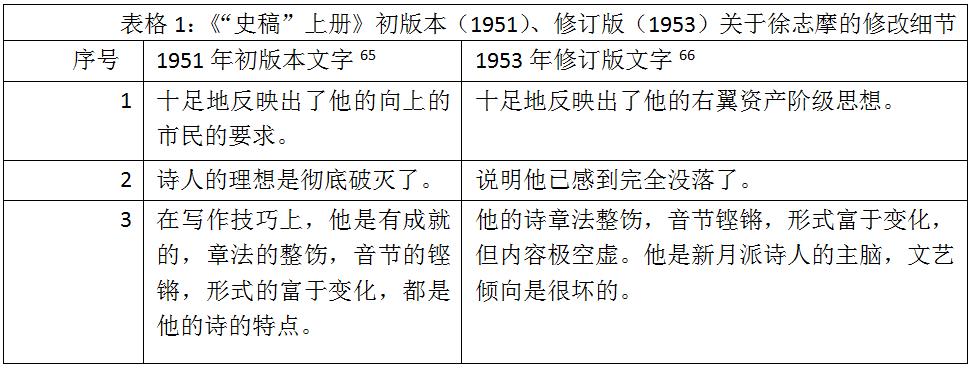 既然是组织意义上的“帮助会”,王瑶面临着巨大的政治压力,不得不对上册内容进行修改。被点名的“新月派”,成为修改的“亮点”和“重点”。对比《“史稿”上册》1951年8月开明书店初版和1953年8月新文艺出版社修订版,我们发现,王瑶主要对“新月派”前期和后期的论述文字进行过“修改”,呈现出版本的文字差异。“新月派”前期,主要集中对徐志摩涉及到的政治定位和政治评价的文字做了增加,具体集中在三处(如表格所示):