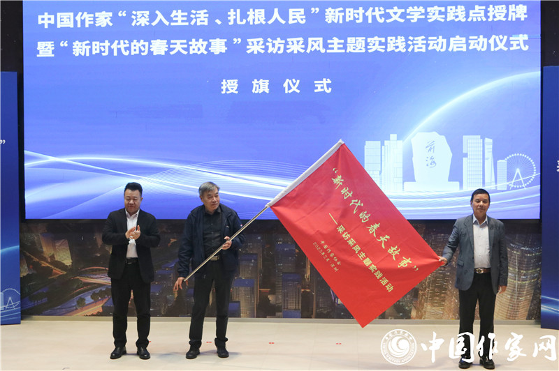 仪式上,彭学明、陈昆、王锦侠分别代表中国作协、广东省作协和深圳市前海管理局签订“新时代文学实践点”三方合作协议。邱华栋代表中国作协授予中国作家“深入生活、扎根人民”新时代文学实践点牌匾,陈昆代表广东省作协授予广东作家“深入生活、扎根人民”新时代文学实践点牌匾,王锦侠代表深圳市前海管理局接牌。邱华栋向采访采风团代表潘凯雄、杨克授旗,正式启动“新时代的春天故事”采访采风主题实践活动。