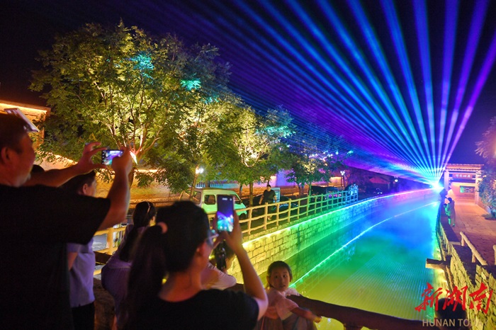 河南省林州市黄华镇庙荒村,游客在欣赏水上灯光秀。近年,该村围绕太行山民居特点,打造“渠畔人家”景观带,蝶变为远近闻名的“网红村”,驶入了乡村振兴的快车道。 湖南日报全媒体记者 徐行 摄