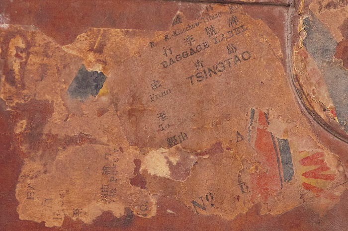 皮箱侧面局部放大可见“BAGGAGE LABEL”,“由”(from)和“青岛”(TSINGTAO)字迹