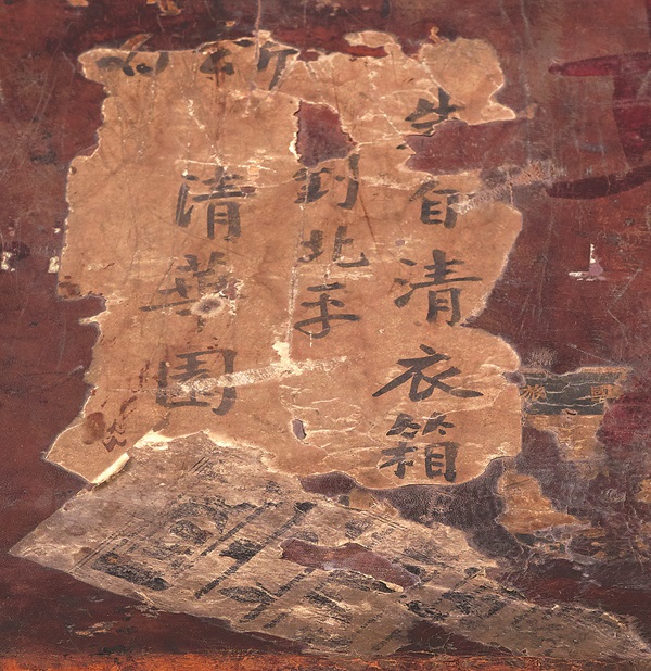 朱自清衣箱的形制是欧式的,国外工艺,使人自然联想到朱自清留学欧洲的情形。朱自清衣箱正面还有一处极微小的残留,是“Pe”和“RA”。不同于前面“青岛”“胶济铁路”的中外文对照,这两处只有几个外文字母,此处纸张比“青岛”残留纸张年代更久。