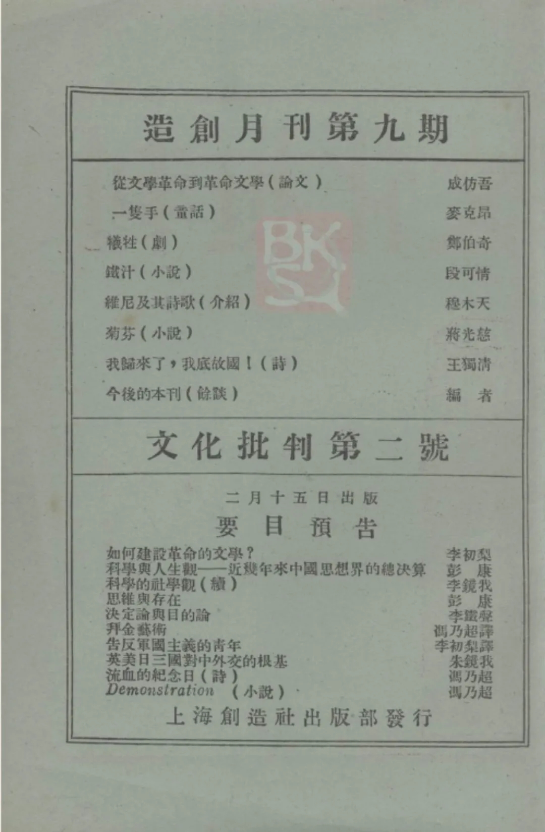 [20] 参见《文化批判》第1期广告页,1928年1月15日。