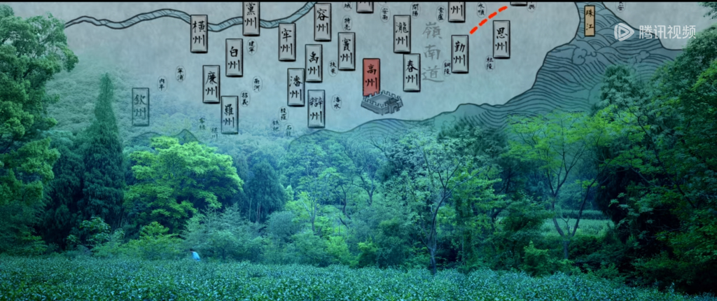 《长安的荔枝》剧照 荔枝运送路线图。按照唐代邮驿“日行五百里”的极限速度,从岭南到长安需十一日。