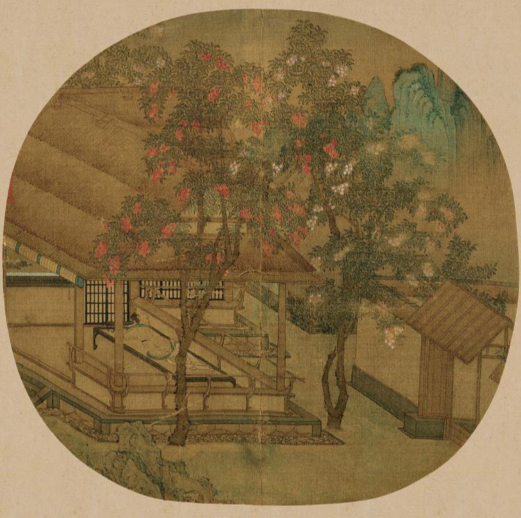 比如南宋《荔院闲眠图》中,荔枝树与高士休憩场景结合,体现“丹荔荫下,心远地偏”的隐逸趣味。一个高士倚在卧榻上,主体建筑的屋顶用修葺整齐的草排盖成,并有障日卷帘,下边围以美人靠。整个亭屋显得空灵。基座为石块砌筑,并铺上鹅卵石散水,与现在的日本园林建筑比较接近。对着两棵荔枝树,两棵荔枝树一株是红色,一株是粉白色。