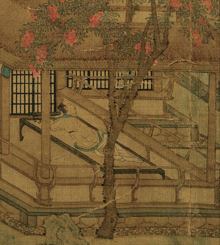 宋《荔院闲眠图》(局部)红色荔枝缀满枝头,高士倚卧榻上,有夏日乘凉之美意。