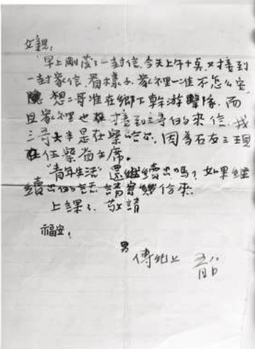 父亲:早上刚发了一封信,今天上午十点,又接到一封家信。看样子家里一准不怎么安(稳),想二哥准在乡下干游击队,而且家里也接到三哥的来信。我三哥大半是在察哈尔,因为石友三现在任察省主席。“青年生活”还继续出吗?如果继续出的话,请寄几份来。上课了,敬请福安!