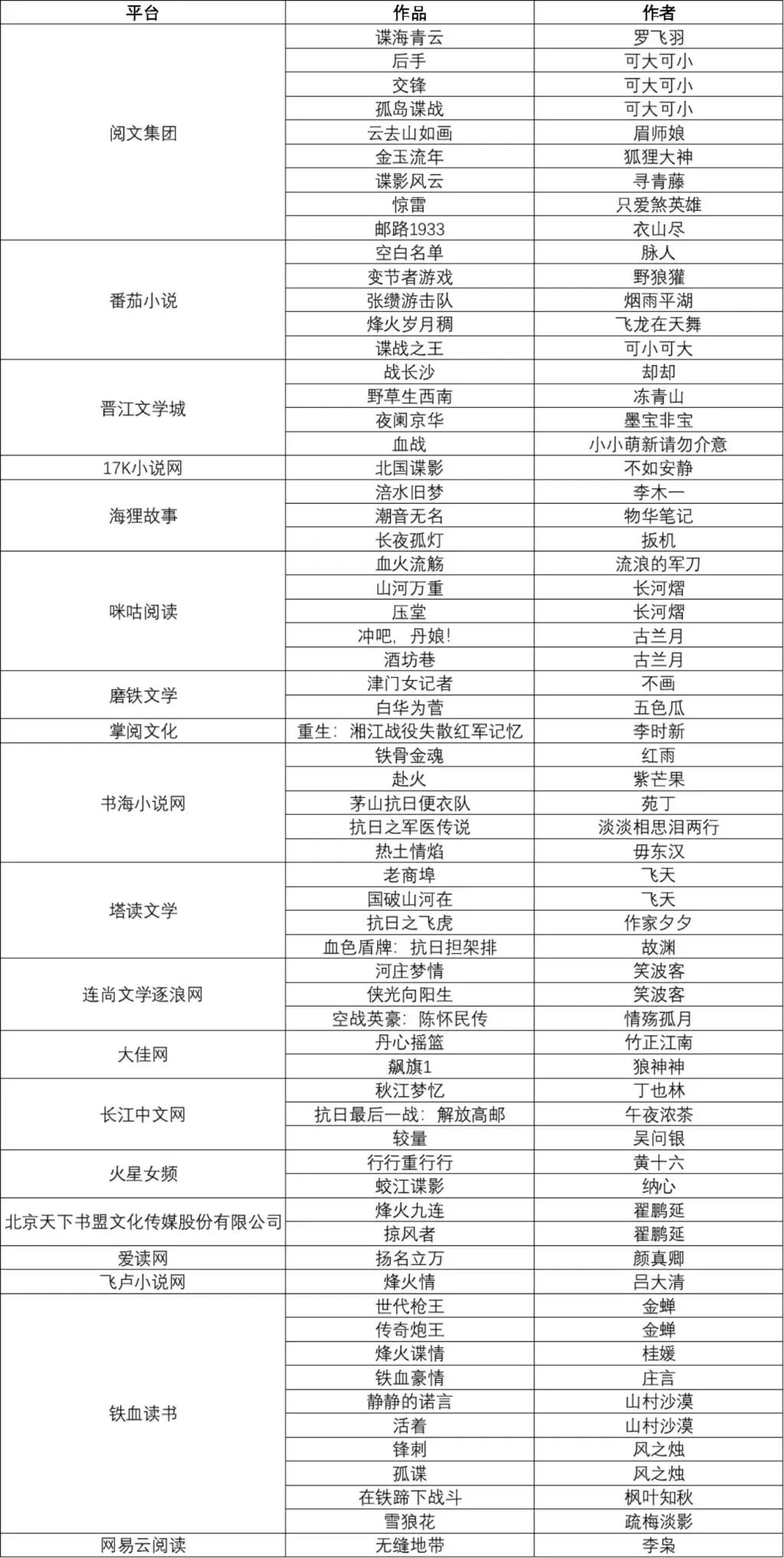 活动期间,涌现出一批优秀抗战题材网络文学作品。2025年度中国作家协会网络文学重点作品扶持项目特设“中国人民抗日战争暨世界反法西斯战争胜利80周年”主题专项,罗飞羽《谍海青云》等7部作品入选。同时,各大网络文学平台也纷纷推出继承革命文化、书写抗战精神的网文佳作。这些作品以可歌可泣的民族英雄形象,展现了天下兴亡、匹夫有责的爱国情怀,视死如归、宁死不屈的民族气节,不畏强暴、血战到底的英雄气概,百折不挠、坚忍不拔的必胜信念。
