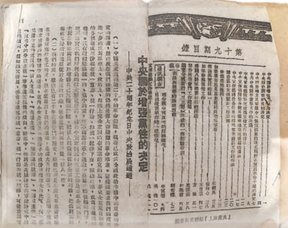 《共产党人》是1939年10月在延安创办的中共中央理论刊物,毛泽东为该刊题写刊名“共产党人”,并撰写了发刊词。杂志每月出版一期,总编辑为张闻天,编辑主任为李维汉,主旨为统一全党思想、明确政治方向、巩固党的组织等。《共产党人》于1941年8月终刊,共出了19期。武光这本《共产党人》就是第19期,扉页上的“共产党人”四个字极为显著,左侧印有“一九四一年八月出版”,目录之后的首篇文章是《中央关于增强党性的决定》。