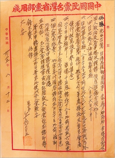 从1946年6月起,丘念台奔走于各市县,邀集各地知名人士15人组成“谢恩团”,由省议员林献堂担任团长。此信就是“谢恩团”临行前夕,丘念台为筹划安排出发事宜给台湾抗日义士姜绍祖之子、新竹县参议员姜振骧所写的信函。信中,从出发行程到团员个人资料准备,再到个人旅费汇寄,各项细节都做了精心安排。