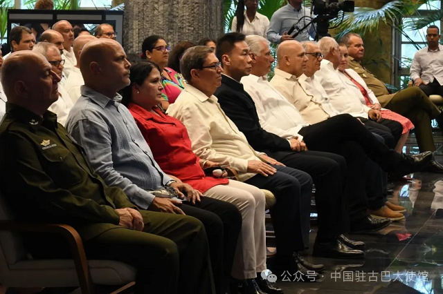 古共中央第一书记、国家主席迪亚斯-卡内尔,中央政治局委员、中央组织书记莫拉莱斯,外交部长罗德里格斯等古巴党政领导人,中国驻古巴大使华昕,中资企业和华侨华人及留学生代表,多国驻古使节及各界友好人士约200人出席。