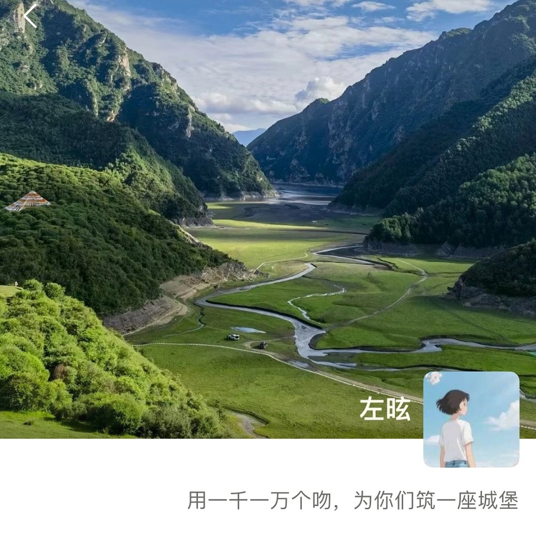 点开左昡的朋友圈,她的背景图展示的是四面环山中的蜿蜒公路,这是临潭冶力关的风景。底下的签名写道:“用一千一万个吻,为你们筑一座城堡。”