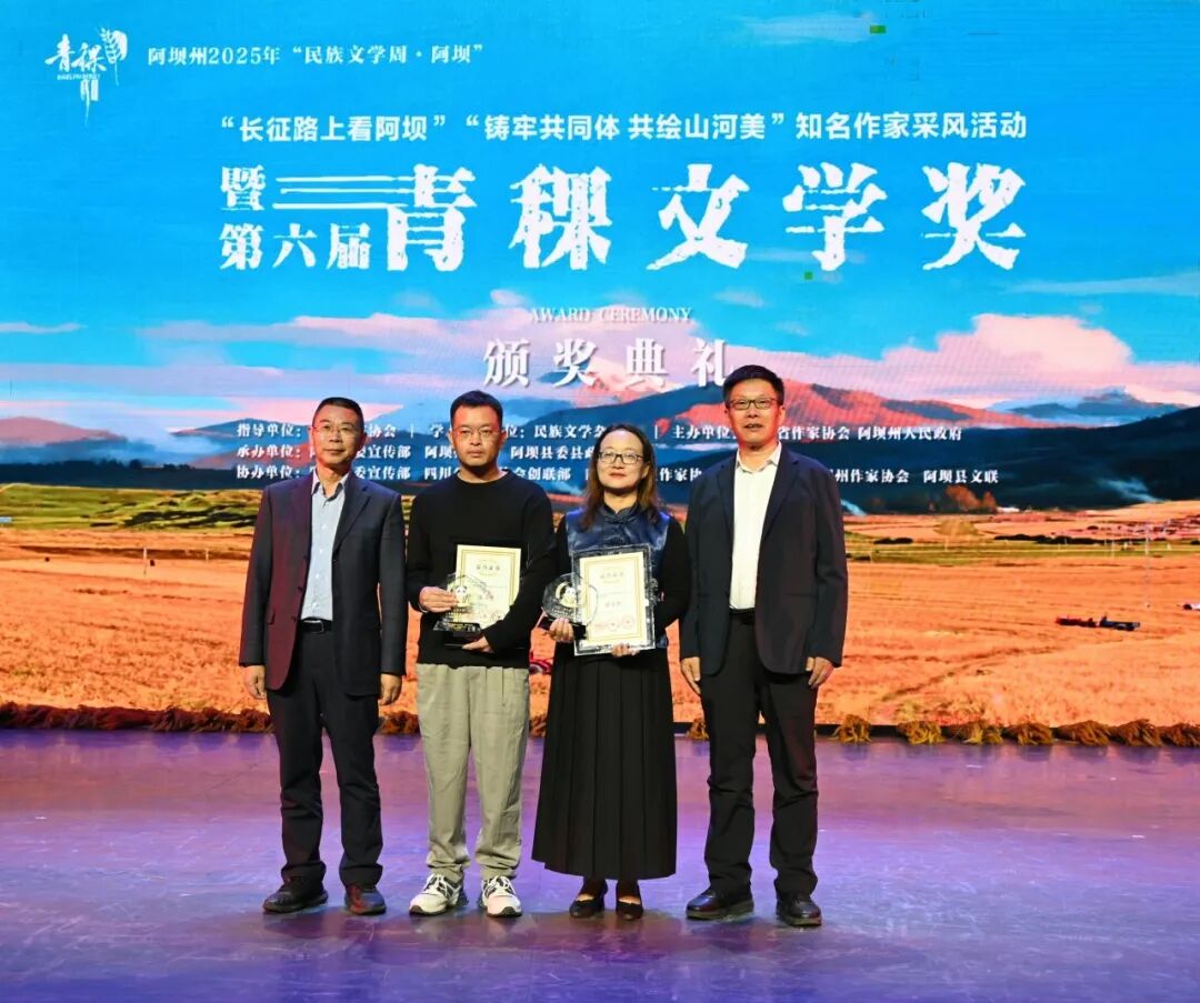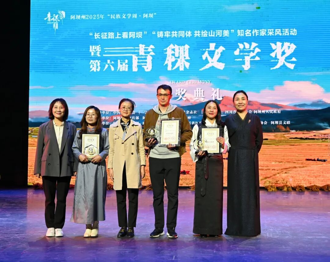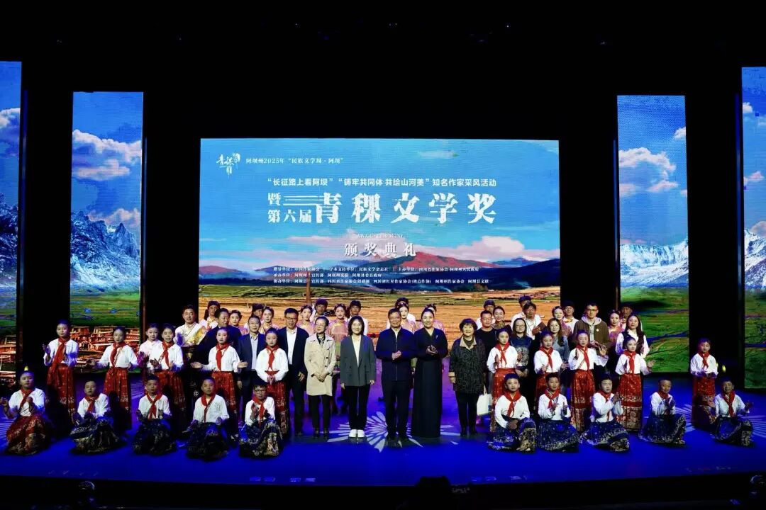 2025年“民族文学周·阿坝”活动期间,由民族文学杂志社提供学术支持,四川省作家协会、四川阿坝州人民政府主办,阿坝州委宣传部、阿坝州文联、阿坝县委、县政府承办,阿坝县委宣传部、四川省作家协会创联部、四川省红星作家协会(省直作协)、阿坝州作家协会、阿坝县文联协办的第六届青稞文学奖颁奖典礼于9月8日晚在四川阿坝州阿坝县成功举办。中国作协党组成员、书记处书记李一鸣,《民族文学》主编陈亚军、副主编朱钢,四川省人大常委会委员、省人大监察和司法委副主任委员、中国作协南亚国际文学交流中心执行主任、四川省作协副主席侯志明,四川省作协党组副书记鲁娟,中共阿坝州委常委、宣传部部长依当措,阿坝州委常委、阿坝县委书记冯峥勇,阿坝州政协副主席何晓兵,阿坝州文联党组书记、主席阿郎,阿坝县委副书记陈波,阿坝县委常委、副县长唐建勇,王怀林、范稳、马丽华、鲁若迪基、尼玛潘多、谭五昌、衣向东、巴久乌嘎、王丽一、杨国锋等知名作家、第六届青稞文学奖获奖作家,以及阿坝州作家代表、阿坝县机关干部、学生群众代表等齐聚一堂,共同见证这一文学盛会。