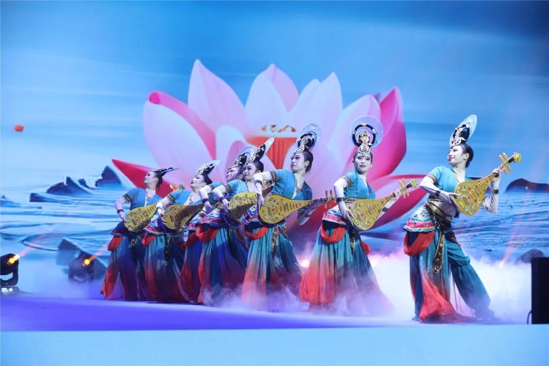 如果说《天下朋友》演绎的是一出热忱好客的迎宾曲,那么唐代诗人白居易《琵琶行》开篇“主人下马客在船”表达的就是一份希望远方宾朋多留片刻的真挚情感。千年之前,白居易到浔阳江边送客,因江面上传来一阵琵琶声留住归程,也成就了“音乐诗中的千古绝唱”。《风起东方》旋律响起,十余位舞者身着初唐时期较为普遍的鸡心领短襦和青色合欢袴,手持金色琵琶,在舞台上翩翩起舞。在舞蹈节目《琵琶行》中,舞者们迎风摆动的衣裙,飘飘翻卷的彩带,仿若从盛唐时期敦煌莫高窟的飞天图壁画中走出来,走进不夜长安的诗歌狂欢。弦音流转间,“嘈嘈切切错杂弹,大珠小珠落玉盘”的意韵犹在;琵琶声声响,传递出跨越山海的诗意和鸣。