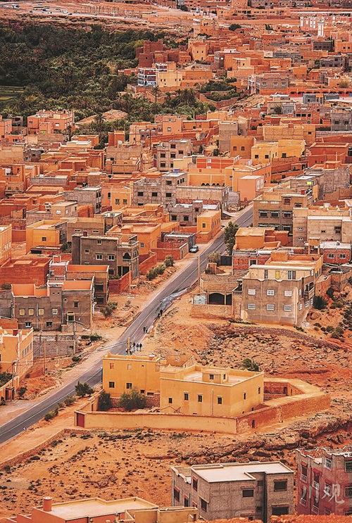 不止《卡萨布兰卡》,很多电影都是在摩洛哥取景。前往沙漠途中经过的阿伊特本哈杜筑垒村和瓦尔扎扎特堪称是摩洛哥的横店。阿伊特本哈杜筑垒村于1987年被评为世界遗产,《阿拉伯的劳伦斯》《角斗士》《权力的游戏》等影视作品都曾在此拍摄。瓦尔扎扎特还有供游客参观的电影城。当然,更吸引我的还是本地人的市井生活。在瓦尔扎扎特的酒店放好行李后,我走到城镇中心闲逛,广场中心围了一圈看表演的当地人。街道不算宽阔,两边支起了摊位,卖甘蔗汁、烤棉花糖、炸爆米花,像极了国内县城的春节景象。没能在国内过年,竟然在异国他乡收获了相似的体验。我买了一杯牛油果奶昔,伴着粉色的晚霞在天黑前回到酒店。