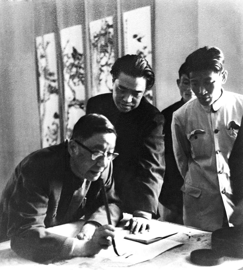 1962年4月,老舍在广东参加潮剧座谈会后为潮剧题词。左二为阳翰笙、右一为潮剧作曲家马飞。