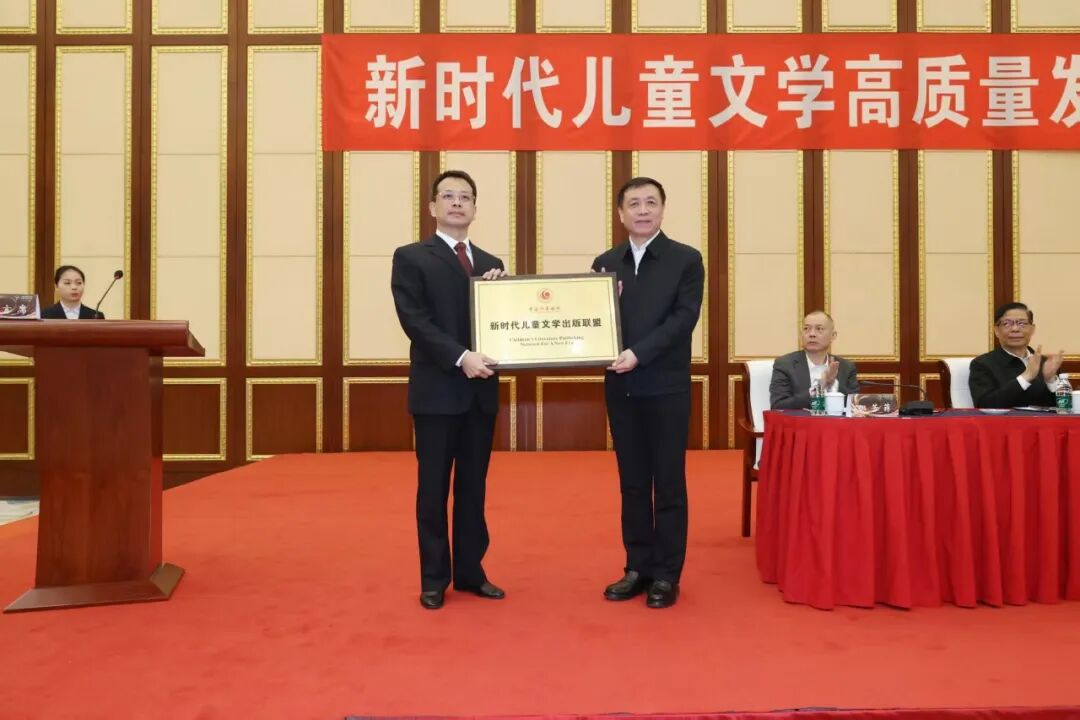 张宏森为中国作家协会新时代儿童文学出版联盟授牌。曾锐接牌,并宣读联盟倡议书。