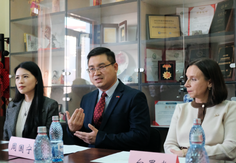 中国驻罗马尼亚使馆教育事务专员周国宁致辞。布加勒斯特大学孔子学院供图