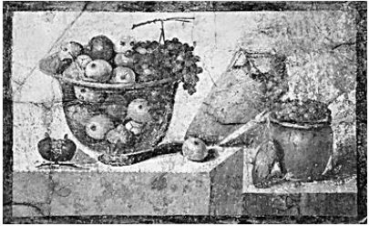 各类食材和食器是庞贝壁画的一个常见主题,这类作品诉诸生活的真实,表现出物品静置的平衡感与静穆之美,因此也有学者将这类呈现静置物品的壁画视为古罗马的“早期静物画”。例如“朱莉亚·菲利克斯之家”里的一幅壁画,左侧透明的水晶杯里盛放着苹果、梨、石榴,一串葡萄挂在杯沿,右侧的陶罐单独装满了葡萄粒,这应当是个葡萄丰收的季节。中间斜置的双耳陶罐中或许装满了醇香的葡萄酒,暗示着房屋主人已备好新鲜的果蔬与美酒,等待客人到访。这样的食材静物画在庞贝城内并不少见,庞贝人对美食和宴饮的嗜好可见一斑。