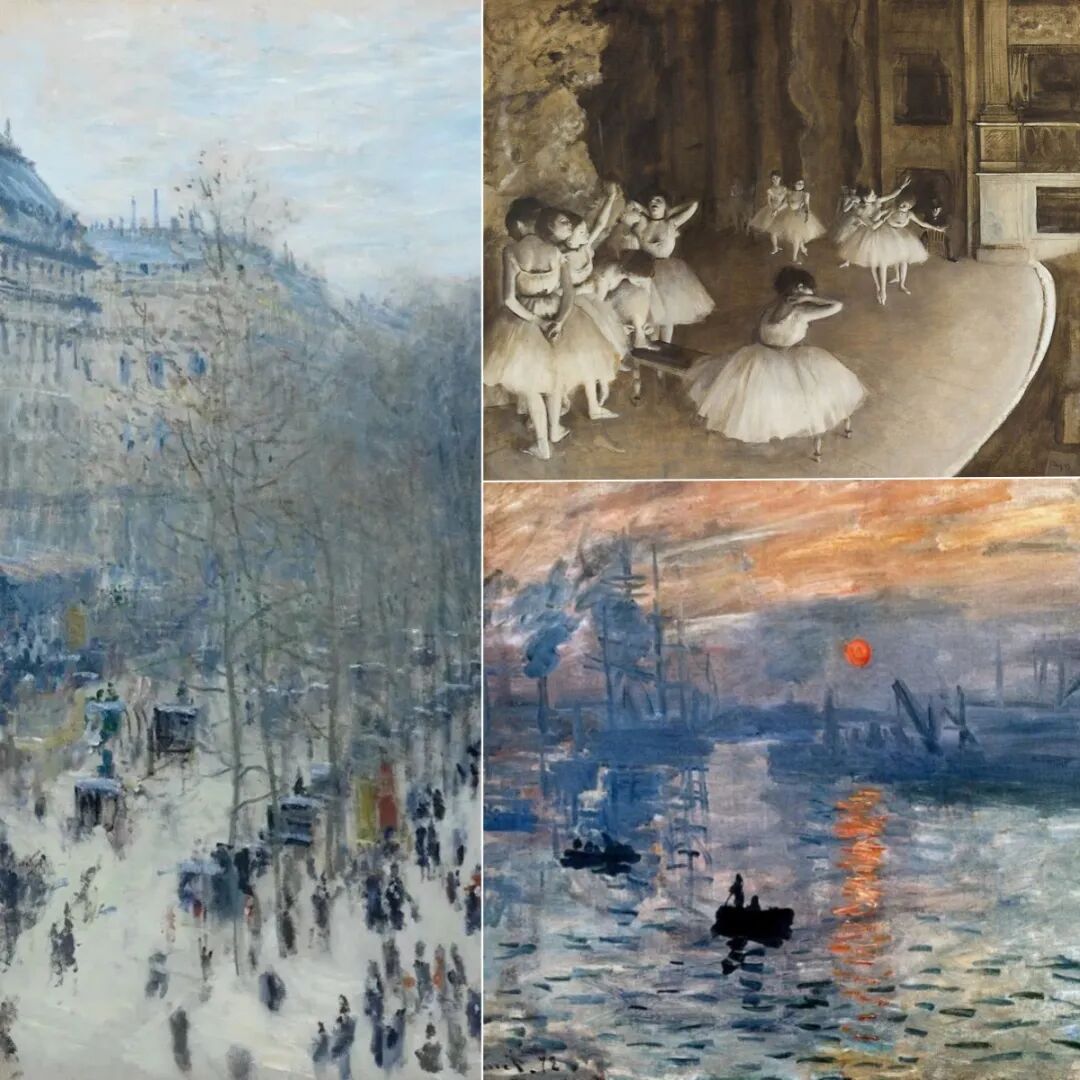 1874年在“无名画家、雕刻家、版画家协会展”上展出的部分印象派画作,从左至右依次为《通往卡普辛的林荫大道》《舞台上的芭蕾舞排练》《日出·印象》。(图片源于网络)