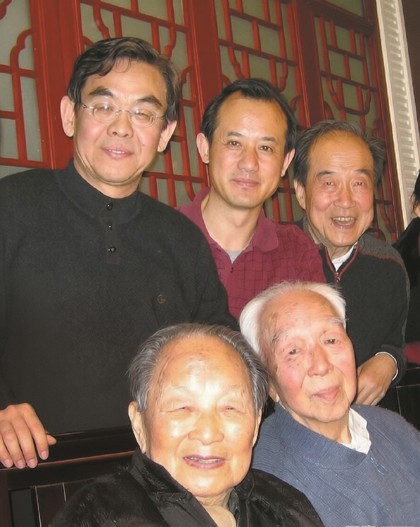2008年2月合影,前左起为黄苗子、杨宪益;后左起为作者、李辉、邵燕祥