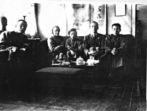 1934年,金岳霖、费慰梅、林徽因、费正清、梁思成(从左至右)在梁林北总布胡同家中客厅。