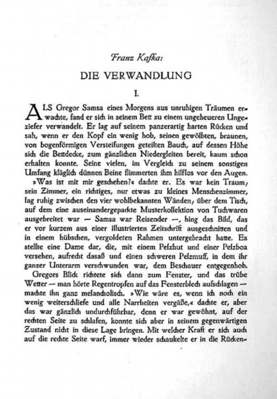 但是,1915年10月中旬,布罗德突然交给他一封来自库尔特·沃尔夫出版社的信,还有几份刚出炉的《白页》杂志。显然,出版社的人弄丢了卡夫卡的地址,所以才委托布罗德转交。看样子事关重大,而且紧迫到没有时间请出版商本人署名。信上签名的是一位叫迈尔的人。卡夫卡打开杂志,几乎不敢相信自己的眼睛:《变形记》全文刊出了,他甚至没有见过校样。