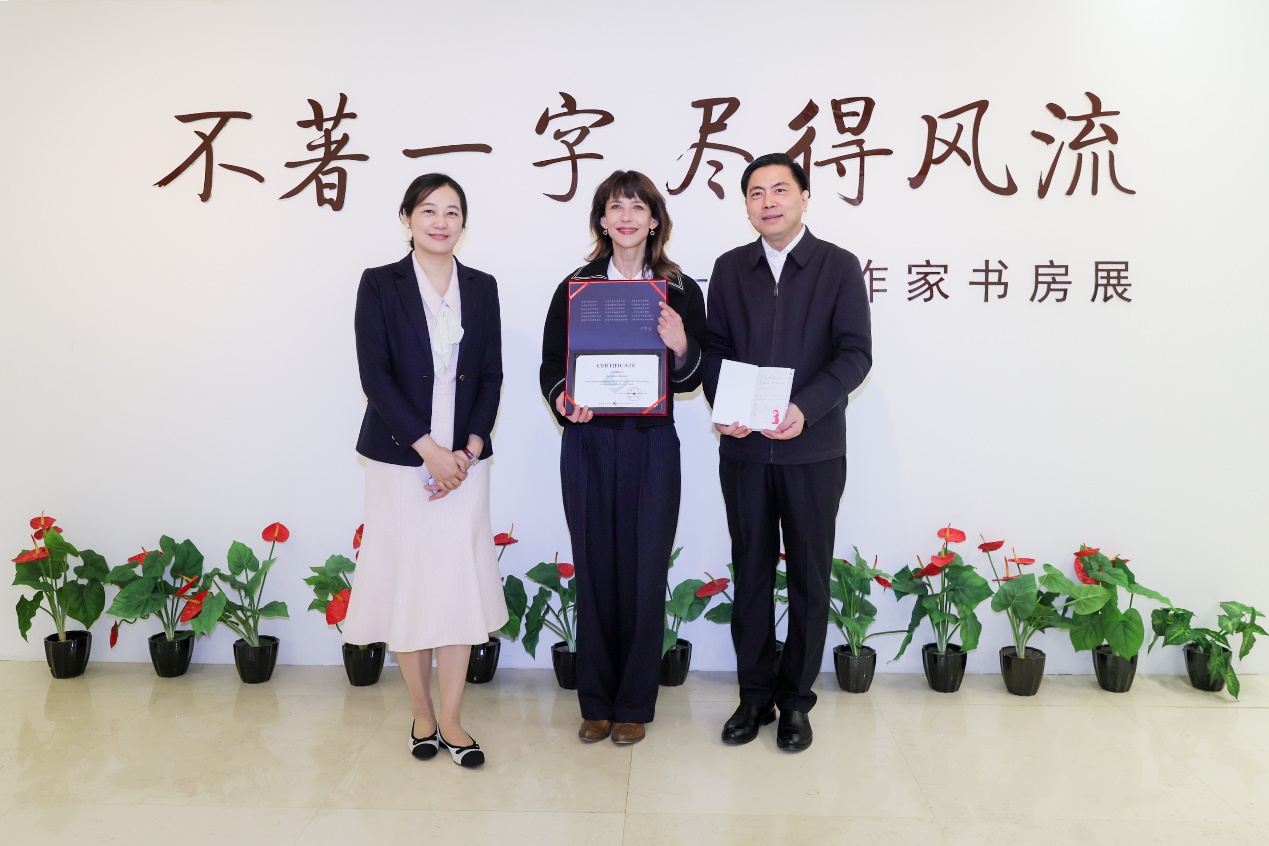 苏菲·玛索向中国现代文学馆捐赠签名著作,中国现代文学馆常务副馆长王军接受捐赠